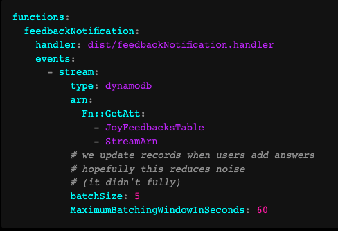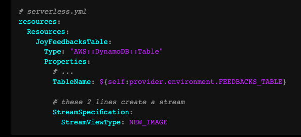 Используем serverles фрейворк для создания нужной архитектуры. Чтобы создать DynamoDB Stream для нужной таблицы, необходимо только добавить в описание таблицы следующий код:
